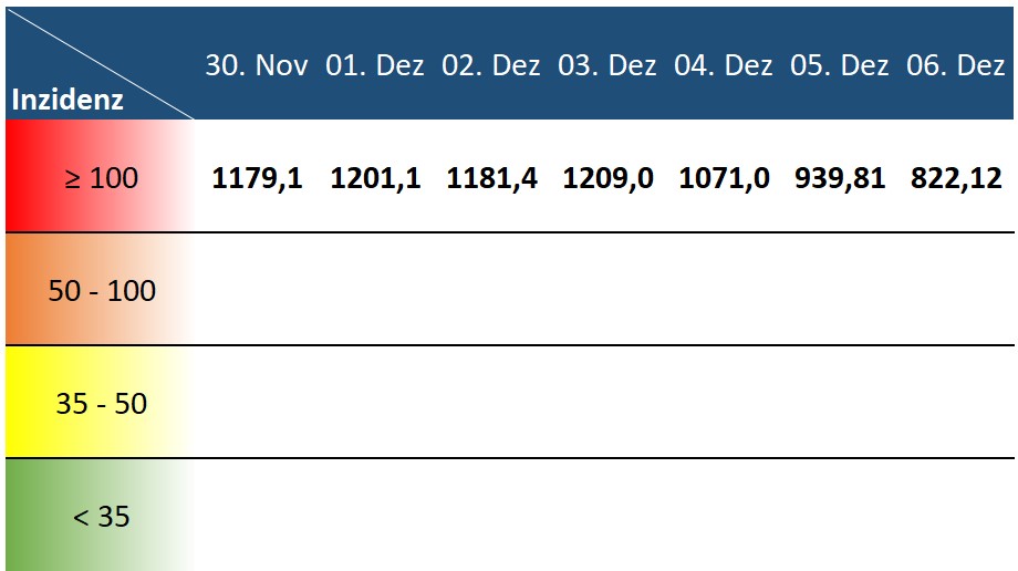 Im Kreis ist die Inzidenz seit einigen Tagen gleichbleibend und lag am 03. Dezember laut RKI bei 1209 und damit deutlich über dem Vorjahreswert von ca. 269. Die Hospitalisierungsrate liegt aktuell bei 45,05.