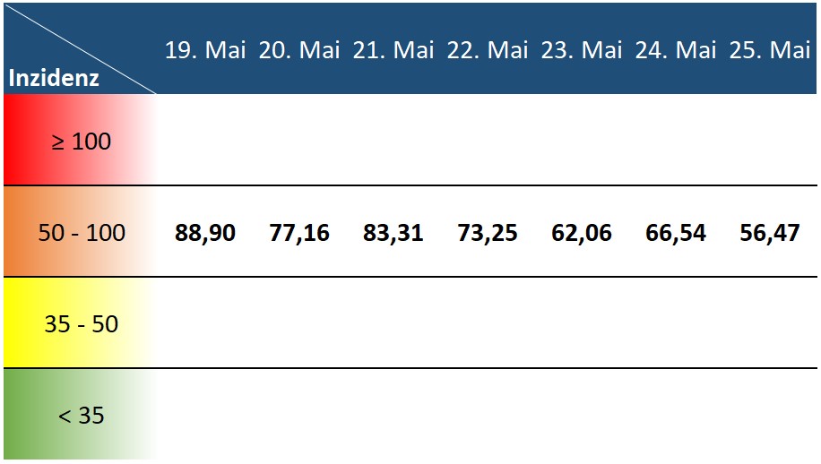 Aktuell liegt die Inzidenz in den vergangenen 5 Tagen zwischen 50 und 100.