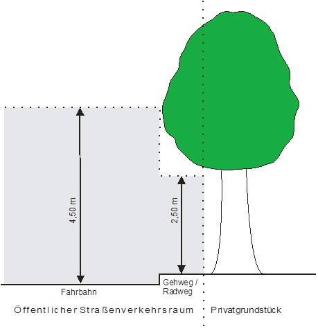 Um sowohl den Auto- und LKW-Fahrern einen reibungslosen Verkehrsfluss auf den Straßen und Parkplätzen, als auch den Fußgängern und Radfahrern die gefahrlose Nutzung von Geh- und Radwegen zu gewährleisten, ist festgelegt, dass über Straßen ein Lichtraumprofil von 4,50 m und über Gehwegen ein Lichtraumprofil von 2,50 m freizuhalten ist.