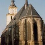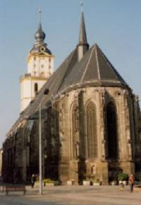1303 geweiht, aber nach Bränden mehrmals erneuert, ist sie eine spätgotische dreischiffige Hallenkirche. Der reich geschmückte Chor entstand ab 1429, das Langhaus ab 1465 durch den Baumeister Johann Reinhard. Die Sonnenuhr am Südpfeiler stammt aus dem Jahre 1446 und gilt als älteste deutsche Sonnenuhr. Der Turmaufbau wurde nach einem Stadtbrand 1718 im Barockstil ergänzt. Die Orgel baute 1862 der Weißenfelser Orgelbaumeister Friedrich Ladegast. Sie besitzt 2772 Pfeifen. Die Statuen von Luther und Gustav II. Adolf wurden 1904/05 aufgestellt. Zweimal, heißt es, habe Luther hier gepredigt.