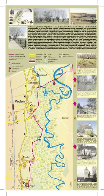 Der Elsterradweg führt weiter durch den historischen Ortskern Profen, Lützkewitz, vorbei am Paradies und der Feuerwehr. Beliebte Ausflugsziele sind in Profen das Wildgehege, der Anglerteich und der Rastplatz mit Aussichtsturm direkt an der „Weißen Elster“.